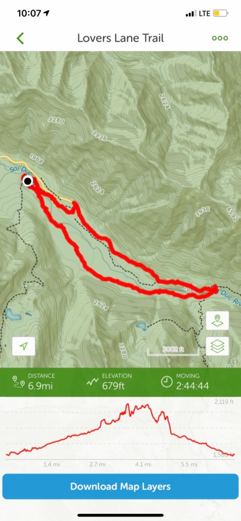 On the way up (1,778′ elevation gain) we encountered steep ascent, rocks, snow on the tail, and a marmot deciding to flop down on the snow bank to cool off. The wildflowers in the subalpine zone were spectacular. By far, the most amazing thing we encountered was the sound of the glacier moving and cracking. Cannot even pretend to try to describe it, what an experience.